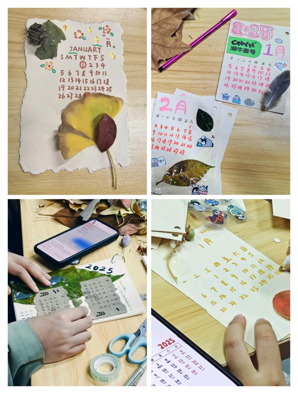 收集到足够的落叶后,同学们又来到“一站式”学生社区青思空间开始充满创意台历制作。