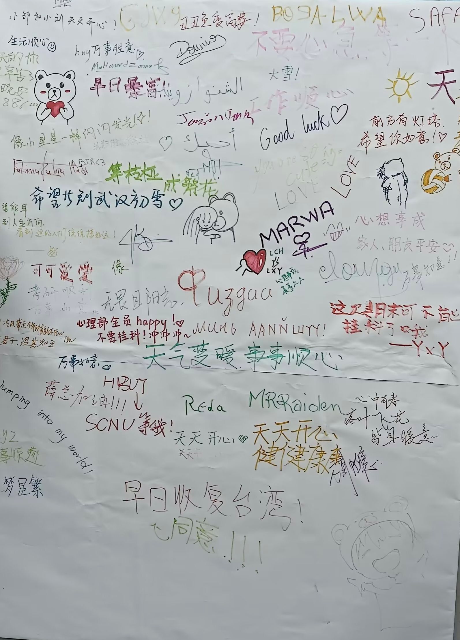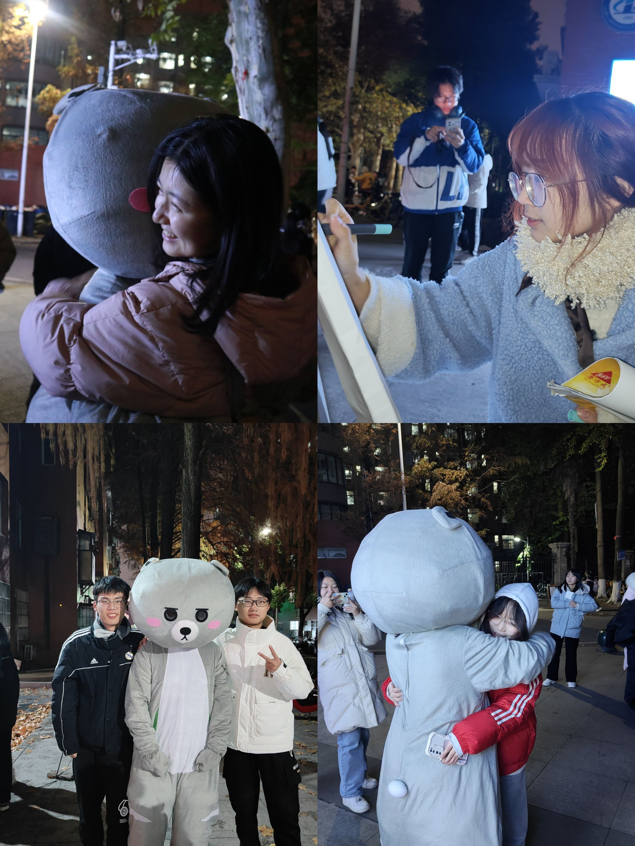 “前面有可爱的小熊,快来。它会抱抱辛苦的你,抱抱努力的你,而你也可以用力地回应它的抱抱。”本次活动中,由小熊担任快乐使者,它手举“爱的抱抱”的牌子,跳着欢快的舞步,与晚归的同学们握手或拥抱,同时还为考研学子送上了五彩糖果和祝福胶囊,活动现场还配有独出心裁的签名墙和氛围灯,并播放着欢快的音乐,如此温暖的场面吸引了众多晚归的同学的参与。