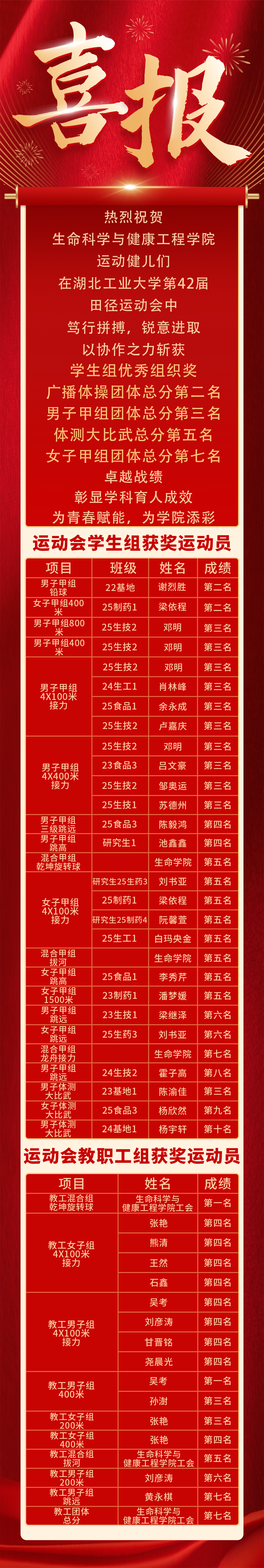 2025年11月,湖北工业大学第42届田径运动会顺利举行并落下帷幕。生命科学与健康工程学院师生在为期两日的激烈角逐中奋勇争先、表现亮眼,集体项目与个人项目屡创佳绩。以昂扬面貌诠释了体育精神,为学院赢得荣誉。教工与学生联袂展现了学院风采,以扎实的佳绩彰显了育人成效。