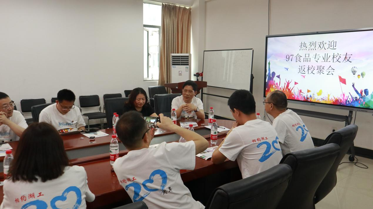 参观完校史馆,校友们在轻工楼A-614召开主题班会,学院院长陈雄教授和97级校友的辅导员兼班导师乔昕参加主题班会。班会现场,学院辅导员周安盛与校友们观看湖工大宣传视频,介绍20年来学校所获得的成就。随后,陈院长对校友们的到来表示欢迎,现场向校友们介绍了本院的师资力量、学科优势及教学环境等方面,并且表达了自己的美好祝愿。校友们纷纷表示,为母校取的成就感到振奋和自豪,定会不负老师嘱托,再接再厉,争取实现更大的人生价值,回馈社会,留名校史。