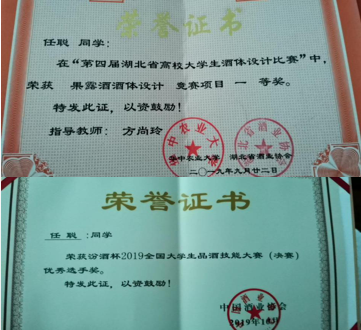 【人物介绍】 任聪:男,生物工程与食品学院16届酿酒1班学生。现就职于茅台集团习酒有限责任公司,在大学期间曾荣获2019“劲牌杯”全国大学生品酒大赛(湖北赛区)一等奖、“汾酒杯2019全国大学生品酒技能大赛”优秀选手奖、第四届湖北高校大学生酒体设计比赛“果露酒酒体”竞赛项目一等奖。
