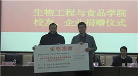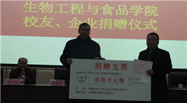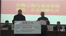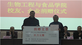会上校友和企业代表先后向学校捐赠,并表达了对学生殷切的期望。周正国代表广州凯虹香精香料有限公司再次向学校捐赠30万元,用于第三期“凯虹香精”助学金,他希望同学们能够珍惜大学时间,好好学习,不断积累成长,将来回报学校和社会。王大春代表武汉新华扬生物股份有限公司再次向学校捐赠9万元,用于第二期“新华扬”奖学金,他希望同学们在未来的日子里,脚踏实地,志存高远,勤于学习,勇于创新,不断提升自己,为学校发展和社会进步做出贡献,以实际行动回馈母校,将这份爱心传递下去;李啸代表安琪酵母股份有限公司向学校捐赠30万元,设立“安琪酵母”英才奖,他希望同学们能够继承生食院精神,脚踏实地,坚持信念,做事执着,勇于创新。董俊代表湖北华龙生物制药有限公司向学校捐赠GMP中试车间的装修及部分配套设备(折合人民币叁佰零叁万陆仟零伍拾叁圆柒角柒分),他希望同学们抓住在学校里的宝贵时间,在未来的创业过程中,做出创新的产品回报国家,回馈社会。胡显波代表校教育发展基金会接受捐赠并为他们颁发捐赠证书。