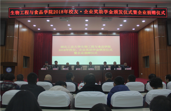 近日,生物工程与食品学院2018年校友、企业奖助学金颁发仪式暨企业捐赠仪式在博学堂成功举行。校党委常委、副校长李冬生,广州市凯虹香精香料限公司总经理周正国、副总经理康家雄及销售总监一行六人,湖北华龙生物制药有限公司董事长董俊,安琪酵母股份有限公司总工程师李啸,武汉新华扬生物股份有限公司副总经理王大春,校合作发展处、计算机学院负责人,生物工程与食品学院全体班子成员以及获奖教师、学生代表出席了仪式。仪式由院党委副书记王辉主持。