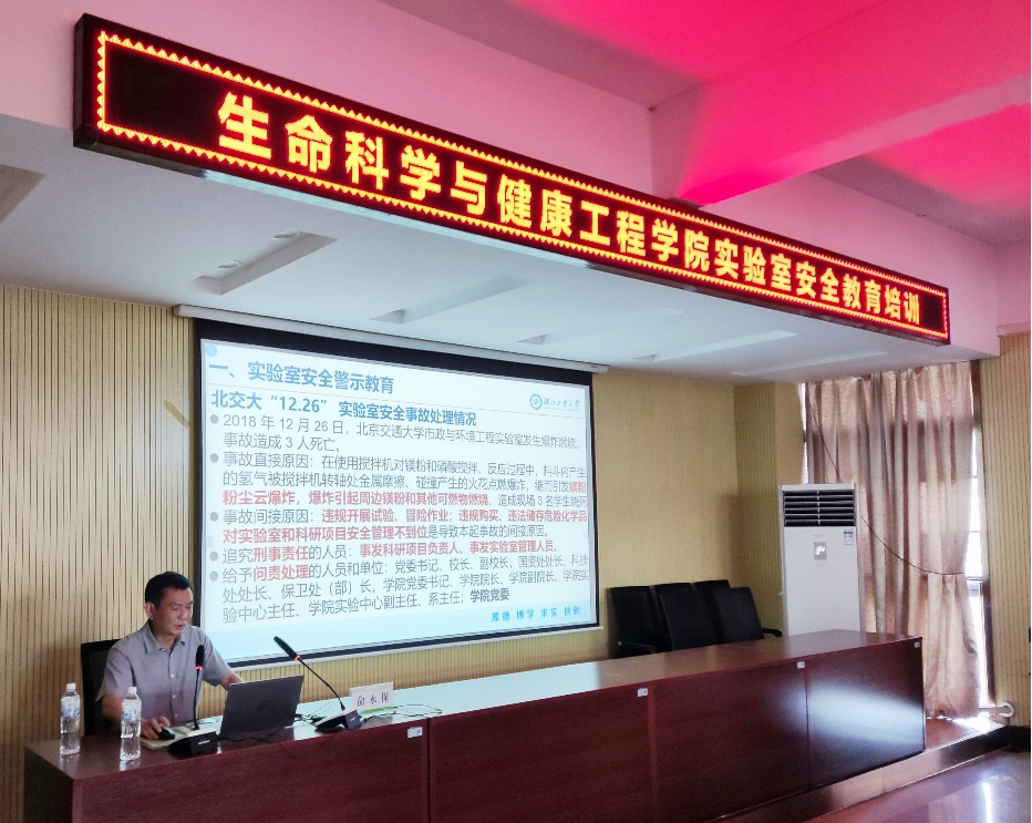 为提升全体师生实验室管理安全意识,增强师生应对突发火灾和危化品泄露的处置能力,6月13日下午,生命科学与健康工程学院联合我校实验室与资产管理处、保卫处在轻工楼报告厅举办了实验室安全教育培训,并在中庭广场进行了应急处置演练。学院领导班子,实验室与资产管理处副处长吴巍、俞永保,保卫处副处长黎冬出席,学院党委书记王辉主持培训活动。武汉市进安消防技术服务中心特级警官扈成瑞应邀为本次活动提供技术指导, 200余名师生参加了培训和演练。