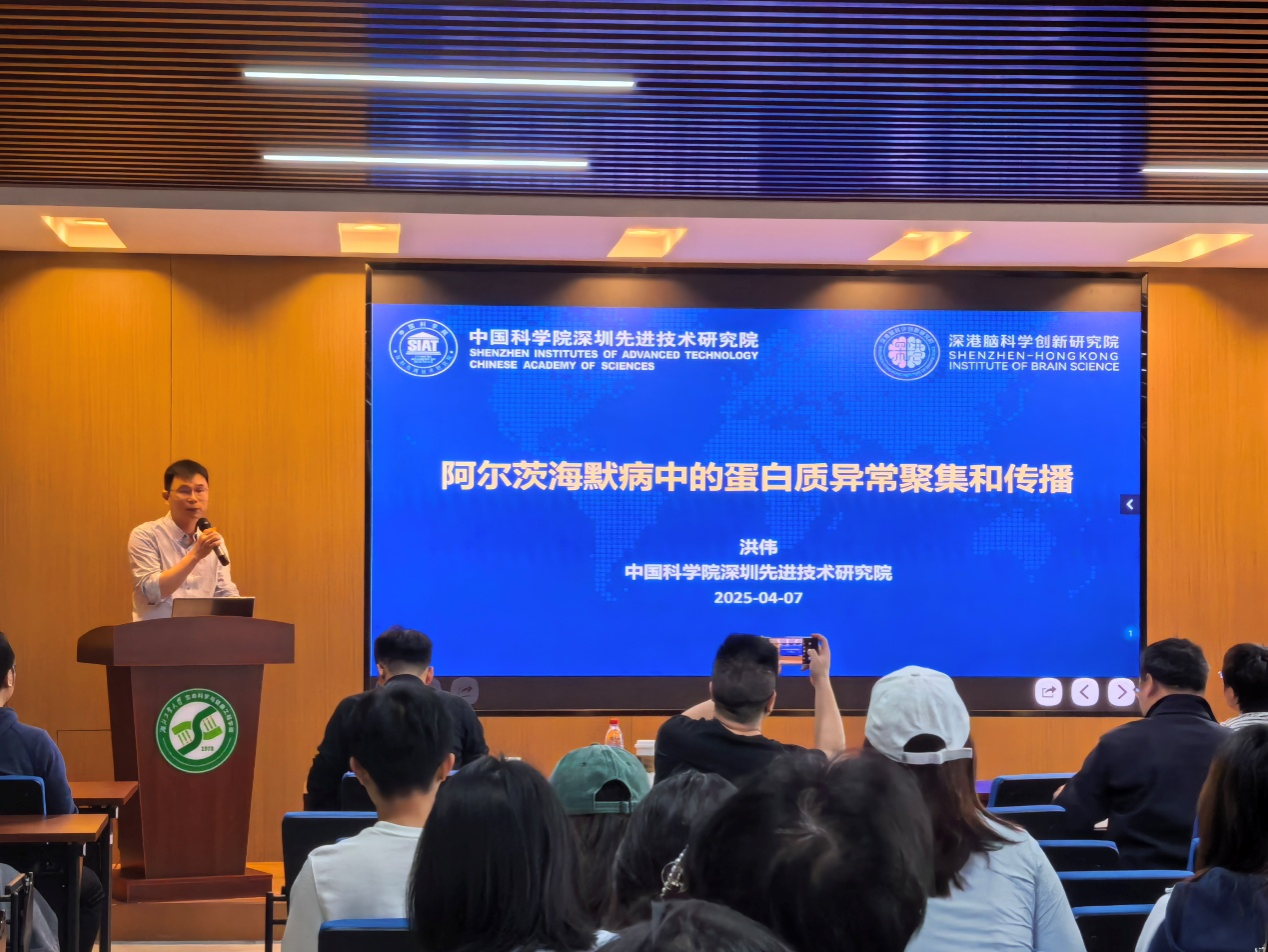 洪伟为师生们分享了题为“阿尔茨海默病中的蛋白质异常聚集和传播”的报告。阿尔茨海默氏病(Alzheimer’s disease, AD)是一种与年龄有关的痴呆症,其中进行性和不可逆的记忆力减退困扰着许多老年患者。β-淀粉样肽(β-amyloid peptide, Aβ)在脑内过度沉积是导致AD的关键原因,Aβ的聚集会导致细胞的凋亡,钙稳态的失调,胆碱能神经系统功能损害等。洪伟本次报告中讲解了自组装效应诱导Aβ二聚体生成的多肽生物学机制以及中枢免疫细胞介导的Aβ异常聚集机制,明确了其在阿尔茨海默病中的作用。