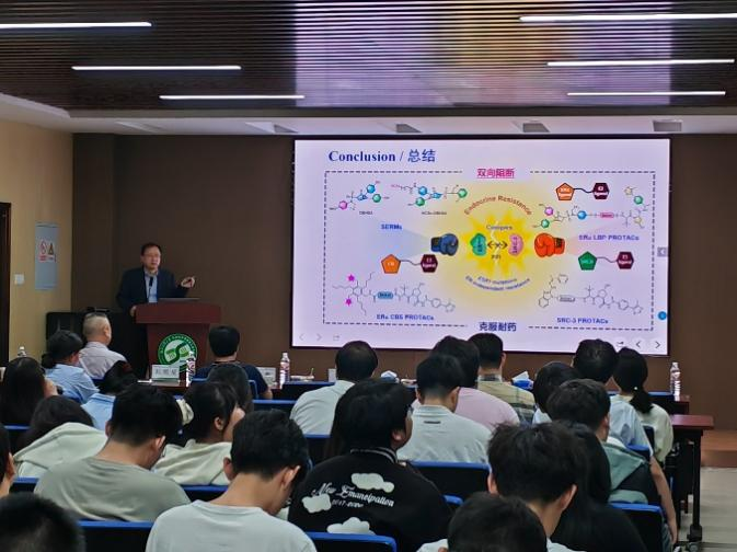 周海兵为师生们分享了题目为“抗内分泌耐药乳腺癌药物研究—从小分子调节剂到靶向降解剂”的报告。针对治疗乳腺癌靶向Erα信号通路的内分泌疗法易产生耐药问题,结合靶向蛋白降解技术和多靶点的药物发现策略,发现了系列结构多样的选择性雌激素受体降解剂。构建了靶向ERα及肿瘤相关因子的双功能小分子降解剂和共价选择性雌激素受体降解剂;基于OBHSA骨架设计并合成了系列靶向ERα蛋白的PROTAC化合物,以上结构新颖和机制独特的分子表现出显著的抗增殖和ERα降解活性,将有助于解决乳腺癌内分泌治疗的耐药性问题。