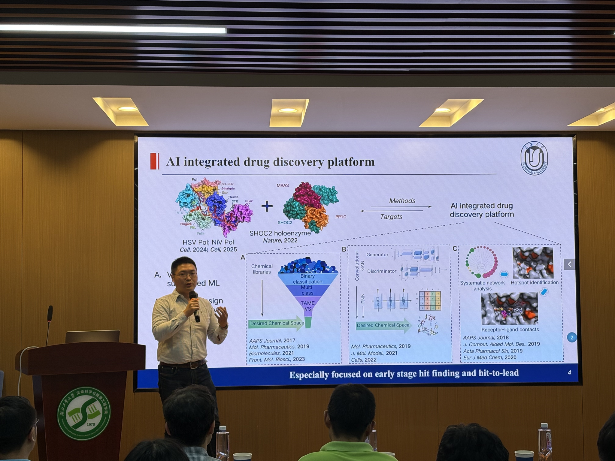 卞月珉为师生们分享了题为“人工智能药物发现与筛选平台的搭建与应用”的报告。介绍了构建以人工智能(AI)为核心、多学科交叉驱动的药物研发平台,将AI平台应用于抗病毒药物耐药机制与新药设计的实例,如通过分子动力学模拟等方法验证疱疹病毒聚合酶全酶结构动态影响抗病毒药物的选择性与耐药性的机理、分析尼帕病毒聚合酶三维结构的动态特征与耐药机制等。此外,卞月珉还深入探讨了通过机器学习与深度学习算法开展超高通量虚拟筛选和生成式配体结构从头设计的方法及针对GPR34、CB2等靶点开展苗头发现与先导优化的研究,强调结构生物学与计算模拟相结合对于预测药物-靶标相互作用以破解耐药性难题的重要性。