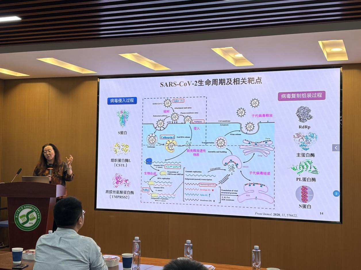 柳红为师生们分享了题为“广谱抗病毒创新药物的研发”的报告。介绍了多个代表性工作,如广谱抗肠道病毒、抗冠状病毒及抗猴痘病毒小分子药物的研发。分享了基于结构多样、种类丰富的抗病毒化合物库筛选设计多个靶向病毒主要蛋白酶的新型广谱、高抑制活性抗病毒小分子化合物的成果。探讨了靶向冠状病毒蛋白酶的多靶点抑制剂的优势,强调多维度先导化合物的发现和小分子化合物库的构建对广谱抗病毒药物研发的重要性。此外,柳红在本次报告中还详细讲解了设计、合成并构建新型小分子药物库,从中筛选针对特定疾病特定靶标的药物并开展药理及结构学机理研究的多个成功案例,为广谱小分子药物的研发提供了普遍的借鉴意义。