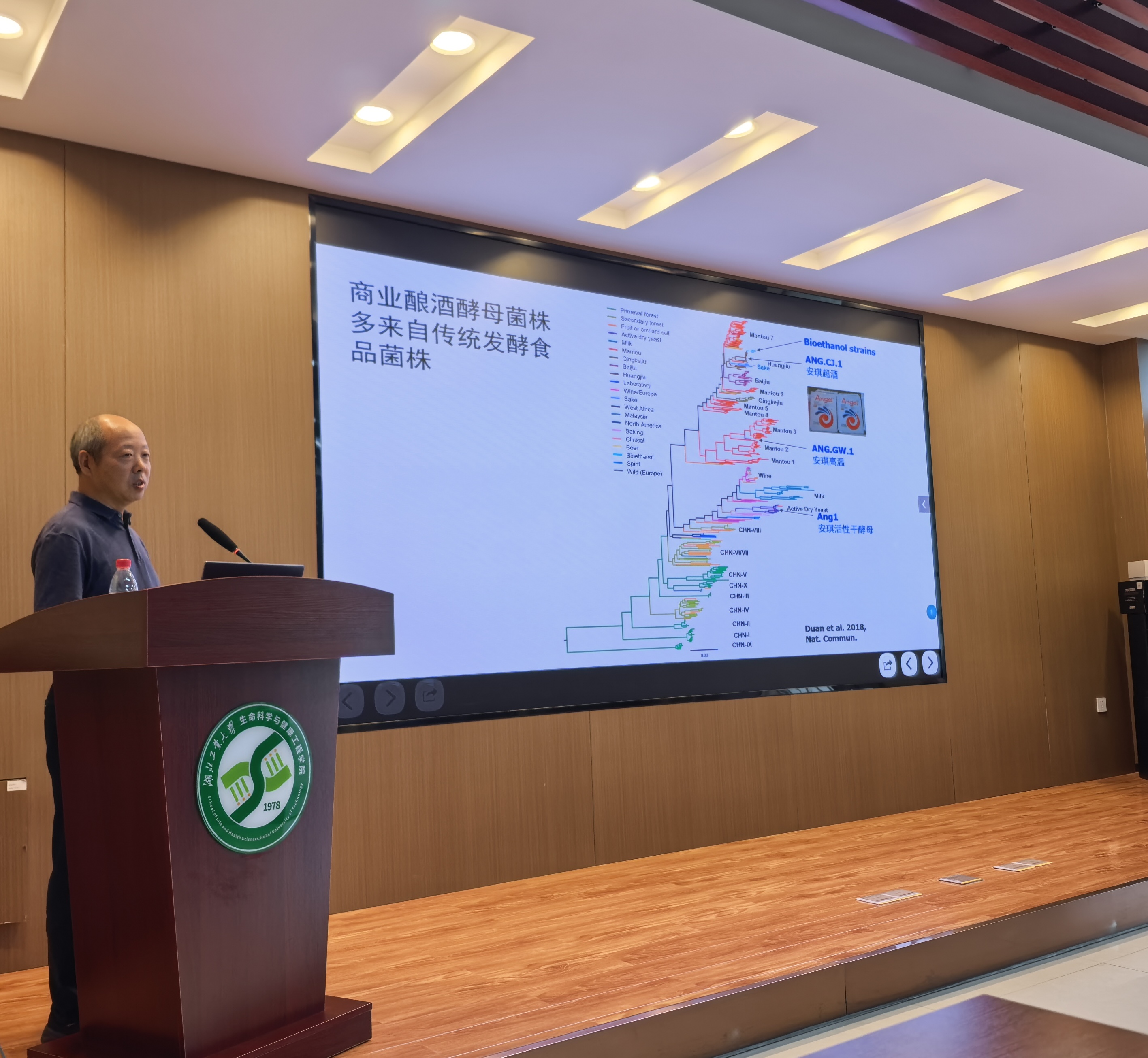 会上,白逢彦为师生们分享了主题为“醉人的进化:酿酒酵母的起源,驯养与环境适应机制”的报告。酿酒酵母菌(Saccharomyces cerevisiae)被广泛应用于酒类酿造和食品发酵等行业,其在我国已具有近万年的应用历史。经过长期有意或无意的人工选择,该菌已经成为适应不同发酵环境和过程、发酵和抗逆性能显著提高的驯养微生物资源,具有重要的开发利用和研究价值。白逢彦本次报告聚焦我国传统发酵食品、饮料及酒类中的驯养酵母菌资源,评估其发酵与抗逆性能,并通过DNA指纹和多基因系统发育分析揭示其遗传多样性及群体演化规律,为培育适应新生产技术需求的优良酵母菌株提供资源与理论支撑。