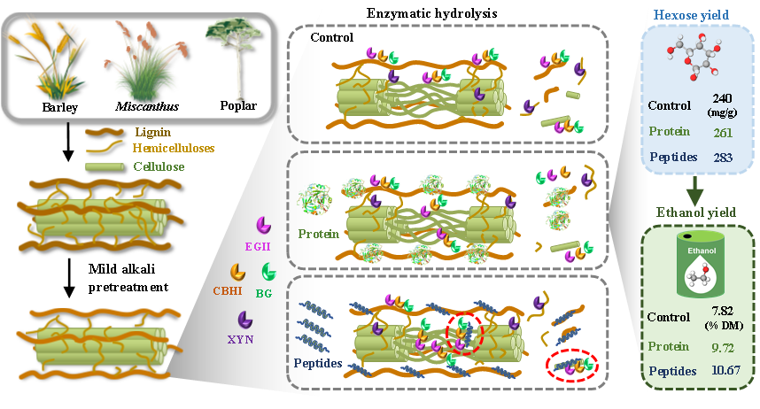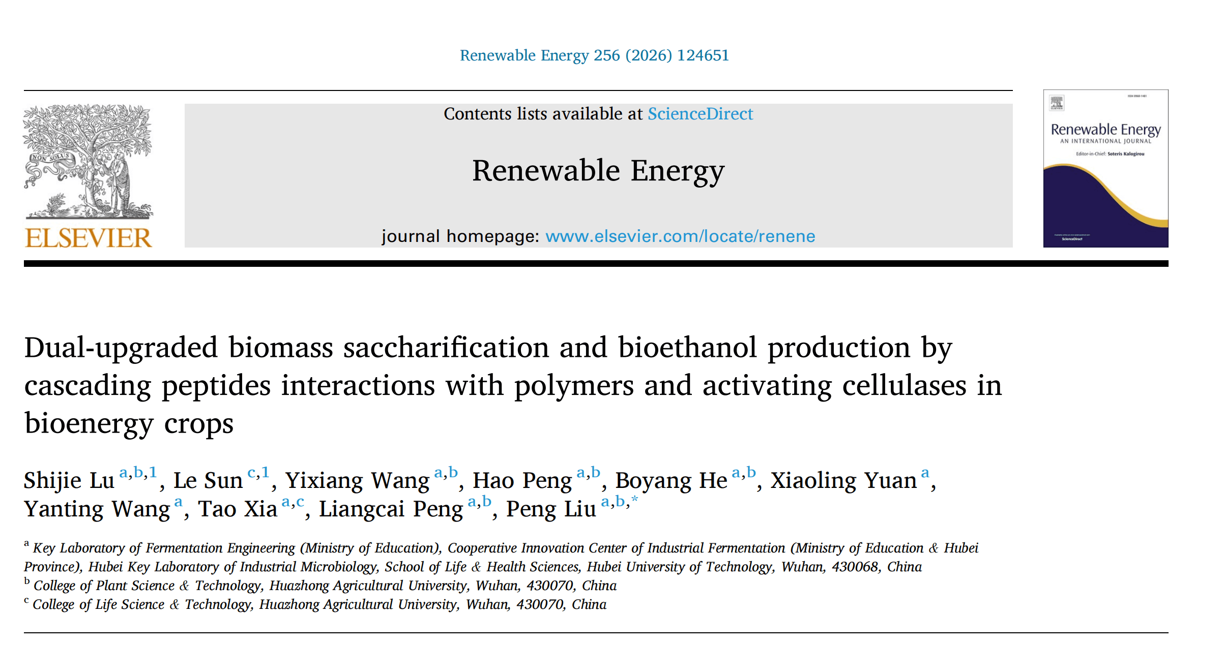 近日,湖北工业大学生命科学与健康工程学院生物质与生物能源团队刘鹏博士联合华中农业大学相关研究人员,在国际能源领域权威期刊Renewable Energy (IF=9.1) 在线发表题为“Dual-upgraded biomass saccharification and bioethanol production by cascading peptides interactions with polymers and activating cellulases in bioenergy crops”的论文。该研究针对木质纤维素生物质转化为生物燃料的核心难题,首次揭示大豆多肽作为绿色生物添加剂的独特作用机制,为生物能源作物的高效、清洁利用提供了全新技术路径。