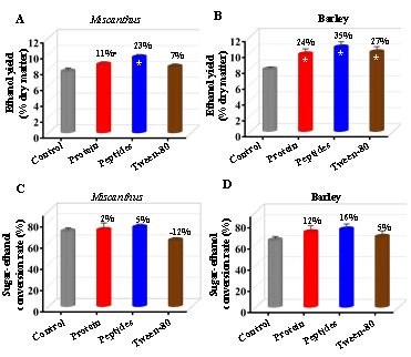 当前,木质纤维素作为储量巨大的可再生生物质资源,其转化利用是解决全球能源危机和环境污染的重要方向,但天然抗降解性导致酶解糖化效率低、成本高,严重制约大规模生物乙醇生产。传统化学表面活性剂或植物蛋白虽能提升转化效率,却存在成本高、效率低等问题,开发绿色高效的强化技术成为行业迫切需求。该论文以芒草、大麦、杨树三种代表性能源作物为研究对象,通过系统实验发现,大豆多肽在生物质转化过程中表现出远超传统添加剂的优异性能,在最优12%的添加剂量下,大豆多肽可使碱预处理后的木质纤维素己糖产量提升20%,生物乙醇产量最高提升35%,糖醇转化效率最高达75%,且显著降低了预处理过程中酸碱的使用强度,更符合绿色生产理念。