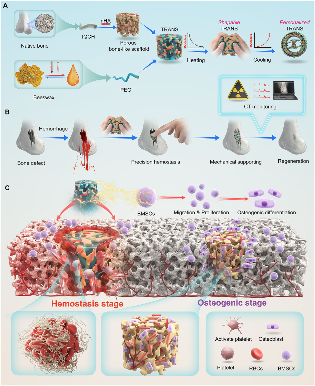针对这一痛点,研究团队受天然骨结构与蜂蜡可塑性的启发,创新性地将CT可视化甲壳素衍生物(IQCH)、纳米羟基磷灰石(nHA)与类蜂蜡聚乙二醇(PEG)相结合,构建了具有热响应特性的仿生骨支架。该支架具备独特的温度自适应能力:加热时机械强度下降,可动态塑形,精准填充不规则骨缺损;温度降至体温时,则恢复高强度力学性能,实现稳固支撑与高效止血,止血速度是临床骨蜡4倍。值得关注的是,支架中的PEG成分在体内会逐步被溶解,恢复多孔结构,为干细胞浸润、增殖与成骨分化提供良好微环境。动物实验表明,在大鼠胫骨缺损模型中,该支架植入10周后,骨体积分数提升至76.3%,骨再生体积分数达48.1%,显著优于传统材料。同时,支架具备优异的CT成像性能,可在体内实现实时监测,清晰呈现支架降解与新骨形成的同步过程,解决了骨修复过程中新骨再生与材料降解动态评估的行业难题。机制研究发现,该支架通过激活TGF-β信号通路,调控生长因子活性与血管相关功能,多维度促进骨髓间充质干细胞的迁移、增殖与成骨分化。此外,TRANS支架采用生物相容性优良的天然高分子和FDA批准材料制备,降解过程温和,无明显炎症反应,展现出良好的临床转化潜力。