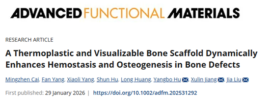 近日,湖北工业大学生命健康学院刘佳教授团队联合武汉大学、中国科学院武汉病毒研究所等单位,在骨缺损治疗领域取得突破性进展。团队研发的一种具有动态形变和CT示踪功能的仿生骨支架(TRANS),成功实现了止血、骨再生与实时监测的动态一体化,为临床骨缺损治疗提供了一体化的解决方案。相关研究成果以“A Thermoplastic and Visualizable Bone Scaffold Dynamically Enhances Hemostasis and Osteogenesis in Bone Defects”为题,发表于国际顶级期刊Advanced Functional Materials(自然指数期刊、中科院一区top、影响因子19.0;原文链接:https://doi.org/10.1002/adfm.202531292)。
