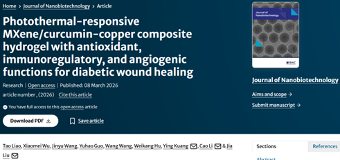 近日,国际知名期刊Journal of Nanobiotechnology(一区top,影响因子12.6)以文题“Photothermal-responsive MXene/curcumin-copper composite hydrogel with antioxidant, immunoregulatory, and angiogenic functions for diabetic wound healing”在线发表了我院“疾病诊疗用纳米药物与生物活性材料”一级学术团队的最新研究成果,该研究聚焦MXene基纳米药物在促进糖尿病慢性创面修复方面的应用(原文链接:https://doi.org/10.1186/s12951-026-04189-5)。湖北工业大学为第一完成单位。廖涛博士为论文的第一作者,刘佳、李草教授与匡映副教授为共同通讯作者。