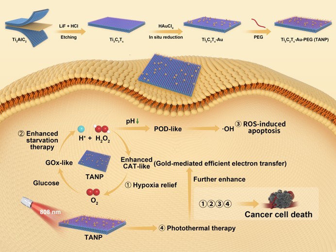 此前,该团队通过自身氧化还原反应,原位制备了负载金纳米粒子的Ti3C2Tx MXene纳米片(Ti3C2Tx-Au),显著提升了Ti3C2Tx MXene的类过氧化氢酶活性,同时引入了类葡萄糖氧化酶及类过氧化物酶特性构建了酶级联系统。该系统可以持续消耗癌细胞内葡萄糖,产生氧气以缓解对治疗不利的肿瘤乏氧,同时产生强细胞毒性的羟基自由基,通过多途径有效杀伤癌细胞,实现肿瘤治疗。相关研究以文题“Gold nanoparticle-loaded multifunctional Ti3C2Tx MXene nanosheets fabricated by in situ reduction to effectively enhance their catalase-like activity for tumor therapy”发表于纳米材料领域顶级期刊Nano Today(一区top,影响因子10.9,原文链接:https://doi.org/10.1016/j.nantod.2025.102848)。湖北工业大学为第一完成单位。李草教授、匡映副教授与中科院余文倩博士、郑迪威研究员为论文的共同通讯作者。