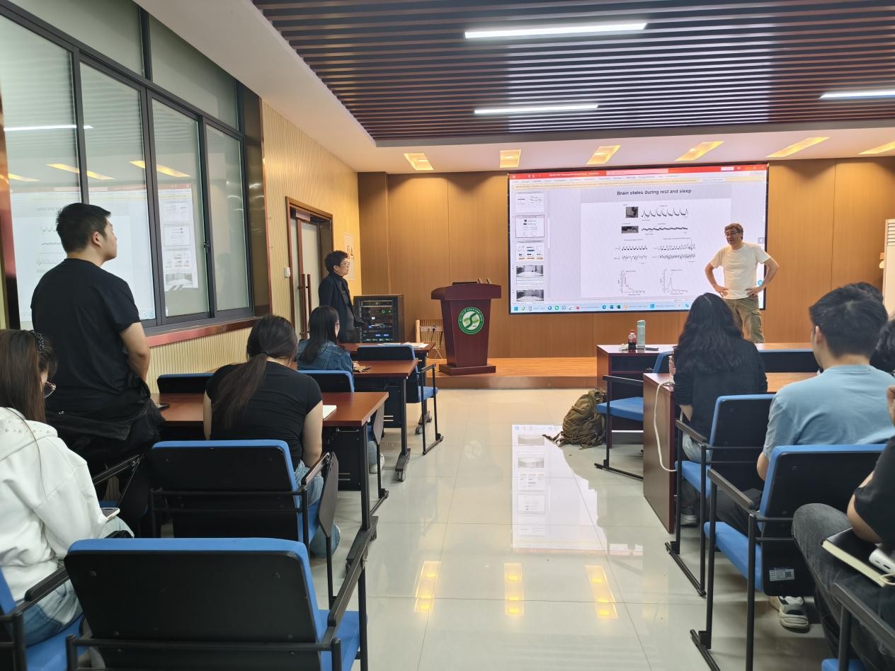 Xavier Leinekugel为师生们分享了题为“A new device to detect small movements in freely moving rats and mice”的学术报告。报告围绕“压电式无创行为监测系统”的提出背景、研究进展和技术应用等三个方面进行。针对传统动物行为监测需侵入操作、主观评分偏差大、无法同步量化行为与微观生理指标的行业痛点,该监测系统应运而生,致力于解决Rotarod、CatWalk等传统方法难以实现自由活动动物自然行为与生理信号同步精准监测的难题,为神经科学、精神疾病相关研究提供客观高效的技术手段。该系统以压力/压电传感器捕捉动物微小振动、结合视频追踪为核心原理,搭建起抗振台、多传感器、高速相机与分析软件一体化的硬件架构,目前已完成多维度监测技术研发与多模型实验验证,实现了宏观行为、微观生理及情绪反应的同步量化分析,精准建立不同行为与压电信号的对应关系,在自闭症、瑞特综合征等神经发育障碍模型,以及恐惧焦虑、睡眠监测等研究中取得一系列关键实验成果,验证了技术的可行性与指标有效性。