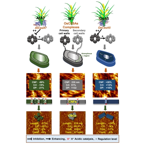 该研究筛选了两类过表达OsCESA5和AtCESA7的转基因水稻株系OsA5和AtA7,分别编码水稻和拟南芥中参与初生和次生细胞壁纤维素生物合成的两类纤维素合酶(CESAs)。大田观察发现,两类转基因材料生长发育正常和种子产量未受影响,但其秸秆生物质量和机械强度与野生型(WT)呈相反变化。生化解析和透射电镜观察显示,OsA5和AtA7转基因株系初生和次生细胞壁的比例呈相反差异,导致OsA5纤维素结晶度和聚合度比WT显著提高6%-13%,而AtA7则降低15%-20%。采用近期建立的原子力显微镜方法,观察到AtA7微纤维表面非晶体区的间隔频率增加,导致细胞壁自组装的CNFs平均长度显著变短(98 nm),而OsA5的非晶体的间隔频率降低,且CNFs长度(296 nm)高于WT(236 nm)。利用传统的64%硫酸或最佳绿色混合酸(硫酸和乙酸)处理粗纤维,AtA7可制备出目前极小的CNCs材料,而OsA5则制备出更长的CNCs,致使OsA5和AtA7纳米晶材料在特定温度下产生相反的热稳定性能。因此,本研究提出了一个全新假设模型,旨在阐明植物初生细胞壁生物合成调控次生细胞壁形成的分子机理以及纤维素非晶体区形成细胞壁“沟槽”结构如何决定CNFs体内组装和体外CNCs化学催化的机制,为生物质绿色、高效、高值、综合利用提供理论依据和技术支撑。