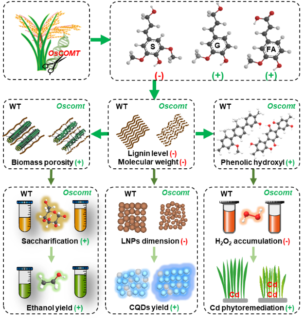 通过定点编辑水稻木质素合成关键的咖啡酸-O-甲基转移酶基因OsCOMT,使S单体合成下调,G单体和阿魏酸(FA)含量增加。与野生型水稻相比,突变体木质纤维素孔隙度显著增加1.8倍,经弱碱预处理可去除58%的木质素,使生物质酶解效率提升32%,生物乙醇产量提高26%。突变体制备出的纳米材料尺寸更小、性能更优,木质素纳米颗粒(LNPs)粒径降低48%,木质素碳量子点(CQDs)荧光产率提升31%。此外,突变体抗氧化能力增强,DPPH自由基清除率提升19%,镉积累能力提高66%。因此,本研究提出了降低木质纤维素顽抗性的遗传修饰模型,解析S单体下调对木质素单体组成与分子量的影响,阐明生物质高效转化纤维乙醇和木质素纳米材料及重金属积累机制,为生物质高值全利用提供理论依据和技术支撑。